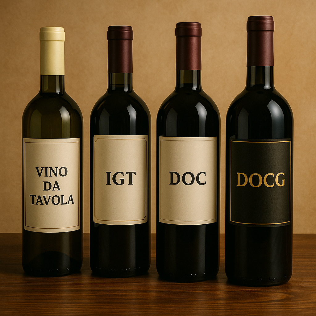Hiện nay, Ý có bốn cấp độ chính: Vino da Tavola, IGT (Indicazione Geografica Tipica), DOC (Denominazione di Origine Controllata) và DOCG (Denominazione di Origine Controllata e Garantita). Cấp càng cao, quy định càng khắt khe và chất lượng càng được bảo chứng.